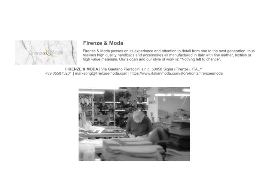 Firenze & Moda passes on its experience and attention to detail from one to the next generation, thus realises high quality handbags and accessories all manufactured in Italy with fine leather, textiles or high value materials. Our slogan and our style of work is: "Nothing left to chance".