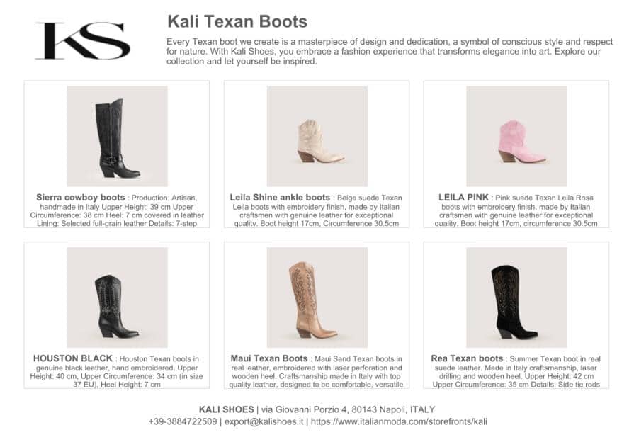 Discover the excellence of Italian craftsmanship with Kali Shoes. Each pair of Texas boots is a celebration of Italian craftsmanship and passion. Handcrafted with care and precision, our boots offer not only distinctive style, but also uncompromising quality. Every detail, from material selection to design, reflects attention to detail and commitment to excellence. Wear a piece of authentic Italian art with Kali Shoes and live the experience of walking in timeless comfort and style.