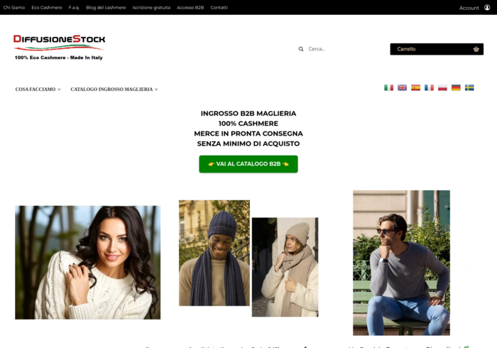 DiffusioneStock: Cashmere Knitwear Wholesale DiffusioneStock: Cashmere Knitwear Wholesale for All RetailersDiffusioneStock is your ideal partner for the wholesale purchase of cashmere knitwear, both for women and men. We offer a wide range of exclusive products, including sweaters, ponchos, scarves, hats and gloves, all made of pure cashmere of the highest quality.A Rich and Diversified CatalogueOur online catalogue is dedicated exclusively to traders and retailers. By registering for free on our platform "diffusionestock.com" by providing all your data correctly, you will be able to access a wide range of products. Each item has a detailed sheet with all the necessary information, including available quantities and prices.Advantages of Registration- Access to Prices: View exclusive prices reserved for retailers.- Detailed Information: Consult the product sheets with detailed descriptions.- Simplified Orders: Place orders directly online with just a few clicks.Quality and SustainabilityQuality is a priority for DiffusioneStock. We select only the best cashmere fibres, guaranteeing eco-sustainable products free from artificial colourings. Our cashmere is ideal for the coldest climates, offering incomparable softness and warmth.Made in ItalyWe are proud to offer products entirely made in Italy, thanks to our factories located in the provinces of Perugia and Florence. The collaboration with our local partners has allowed us to become a leader in the cashmere sector, maintaining the prestige of 100% Made In Italy.ConclusionDiffusioneStock is your trusted source for wholesale cashmere knitwear. With a constant commitment to quality and sustainability, we offer products that combine elegance, comfort and Italian artisan tradition. Register today and discover our extraordinary world of cashmere knitwear! Pictures