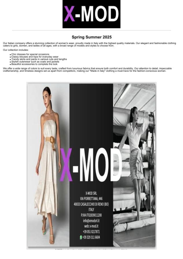 X-MOD srl is a company that specializes in the production of clothing, bringing together experience, creativity and innovation. It deals with all the services necessary for the creation of garments for women, men, and children, also serving luxury brands and the premium market.